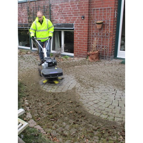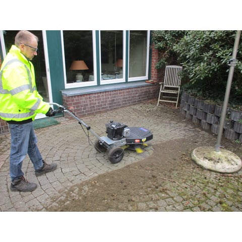 De onkruidborstelmachine is opgebouwd uit een gegalvaniseerd frame met een v-snaar aandrijving naar de borstel. De aandrijving van de borstel is uitgevoerd met een B&S motor.